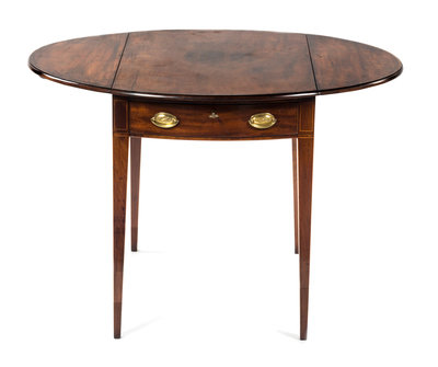 having a rectangular top with rounded ends over D-shaped leaves and a frieze drawer, raised on square tapering legs, restored by Robert Whitley of Solebury, PA.