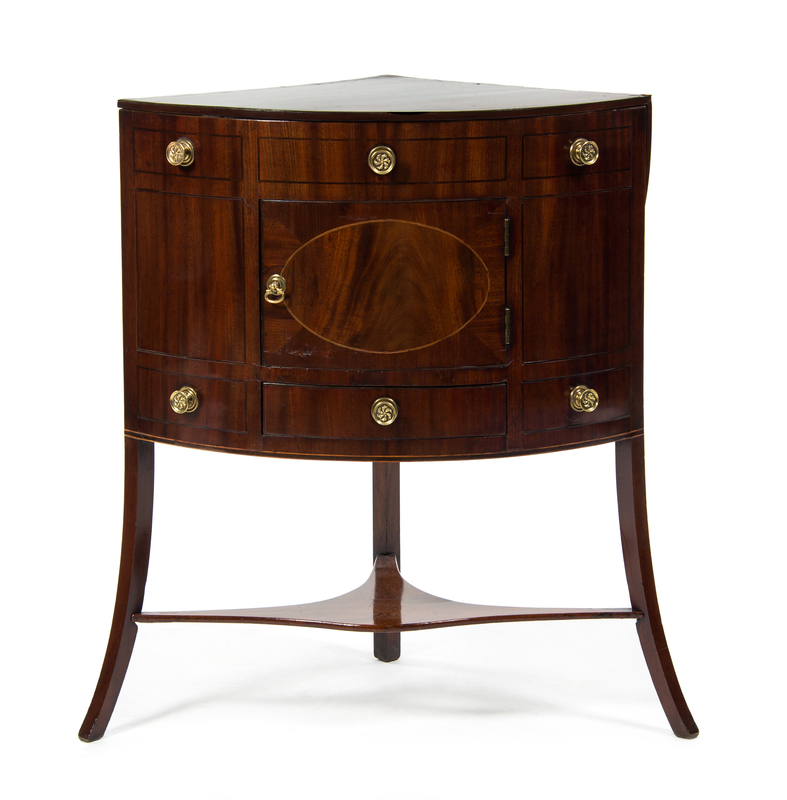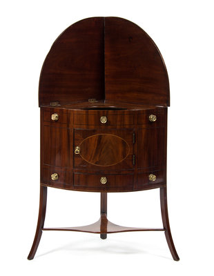 having a shaped backsplash over a cut out top and a conforming case enclosing a cupboard door and a single drawer, raised on splayed legs.