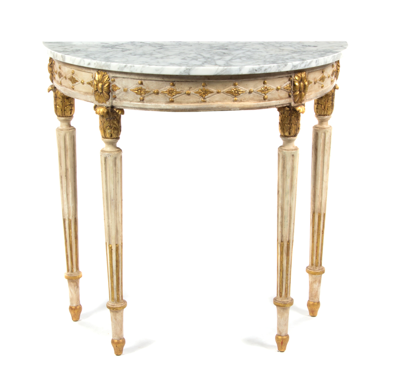 having a demilune marble top over a foliate decorated frieze, raised on cylindrical tapering legs.