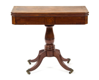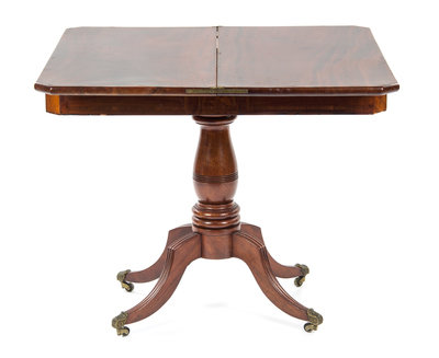 having a rectangular top with canted corners opening to square, set on a turned standard raised on four fluted legs ending in brass casters.