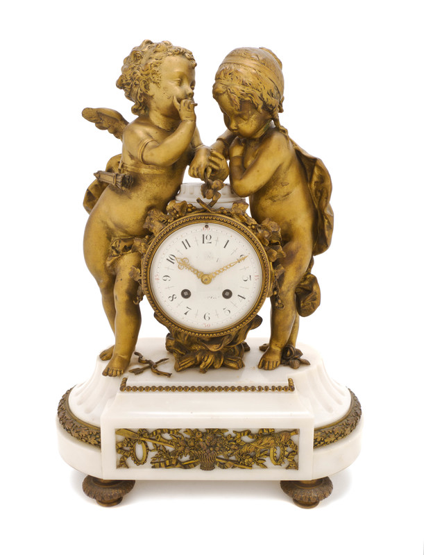 A Louis XVI Style Gilt Bronze and Marble Figural Mantel Clock,