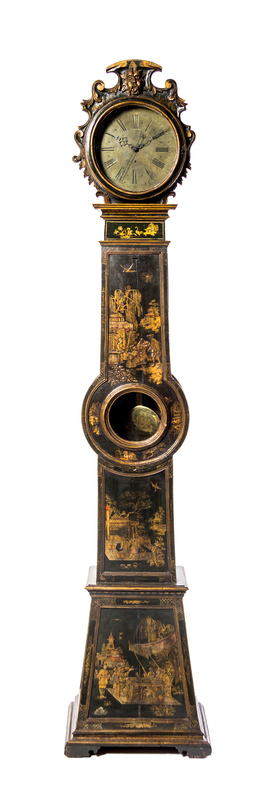 having a lion mask carved crest over the brass dial with Roman hours and Arabic minutes, set in a tapering case decorated with Chinoiserie scenes throughout.