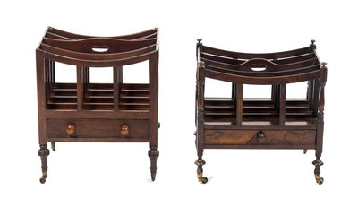 comprising a rosewood example and a mahogany example, each raised on turned legs ending in brass caps and casters.