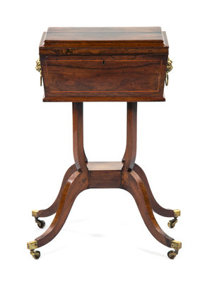 having a hinged rectangular top opening to a fitted interior, raised on square supports and splayed legs ending in brass caps and casters.