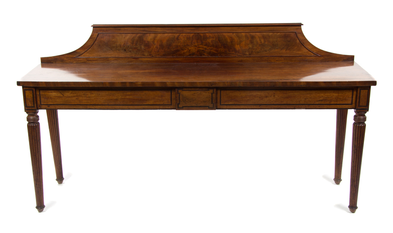 having a rectangular top with a shaped backsplash over a line inlaid frieze, raised on reeded tapering legs.