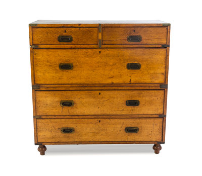 in two parts, the superstructure with two short drawers over a long drawer, the base with two long drawers, the whole raised on turned toupie feet.