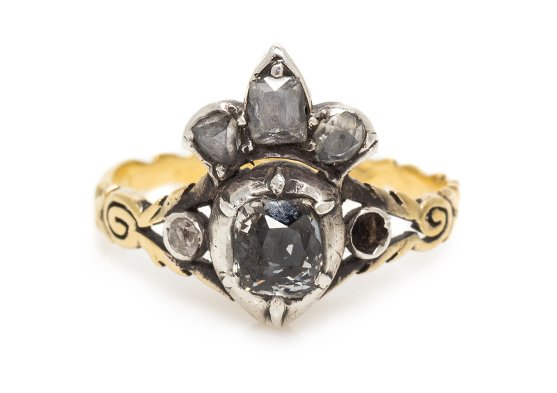 consisting of a central foiled back silver crown motif containing one antique cushion cut diamond measuring approximately 5.30 x 4.80 mm surrounded by four near round, triangular and rectangular rose and old mine cut diamonds, the reverse in a scalloped yellow gold design, the band in a textured openwork design depicting scrolled and foliate motifs.