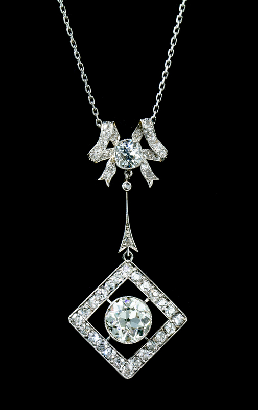 consisting of a bow motif center containing one old mine cushion cut diamond weighing approximately 1.00 carat and numerous old mine cut diamonds weighing approximately 0.45 carat total, the bow section suspending a lozenge shape drop containing one old European cut diamond weighing approximately 3.40 carats and numerous old mine cut diamonds weighing approximately 1.44 carats total, the pendant suspended from a trace link chain.