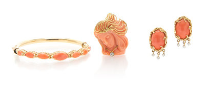 consisting of a 14 karat yellow gold bangle bracelet with seven oval shape pieces of coral, a pair of 14 karat gold earclips containing pink coral cabochons and diamonds together with an 18 karat yellow gold brooch containing a carved coral in the shape of a woman and one round brilliant cut diamond.Brooch stamp: 18K CELLINO.