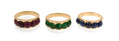 A Collection of Yellow Gold, Ruby, Emerald and Sapphire Stacking Rings,