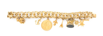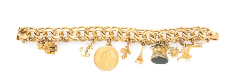 containing a spyglass charm, a duck charm, a lion and bloodstone fob charm, an 18 karat gold Eiffel tower charm, a fleur-de-lis charm, a US Liberty Head ten dollar coin dated 1881, an anchor charm, a 14 karat gold and seed pearl pin charm, and a bird charm. Charm bracelet stamp: 14K.