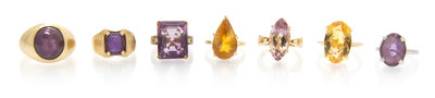 consisting of seven rings, one containing a round cabochon cut star ruby, one ring containing an octagonal step cut amethyst and two round single cut diamonds weighing approximately 0.04 carat total, one ring containing one oval mixed cut citrine, one ring with one marquise mixed cut rose quartz, one ring with one pear shape mixed cut citrine, one ring with one oval mixed cut amethyst and one ring with one octagonal step cut purple glass.Stamp: 14K.