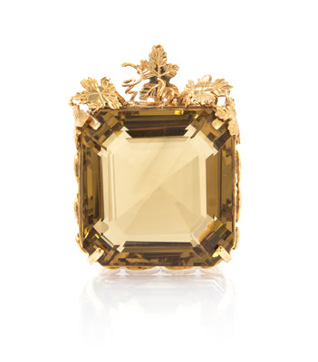 with a foliate garnish containing one octagonal step cut smokey quartz measuring approximately 33.10 x 32.50 x 22.24 mm.