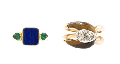 consisting of an 18 karat yellow gold ring containing one octagonal lapis lazuli tablet and two pear shape mixed cut emeralds, together with one 14 karat gold ring containing two carved tiger's eye segments and 16 single cut diamonds weighing approximately 0.24 carat total.