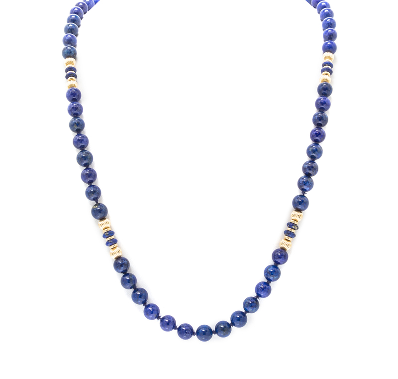containing 79 lapis lazuli beads measuring approximately 7.93-8.30 mm in diameter, 12 lapis lazuli rondelle beads measuring approximately 6.00-6.15 mm in diameter and numerous polished rondelle and fluted gold beads, strung knotted with a 14 karat yellow gold clasp. Stamp: 14K.