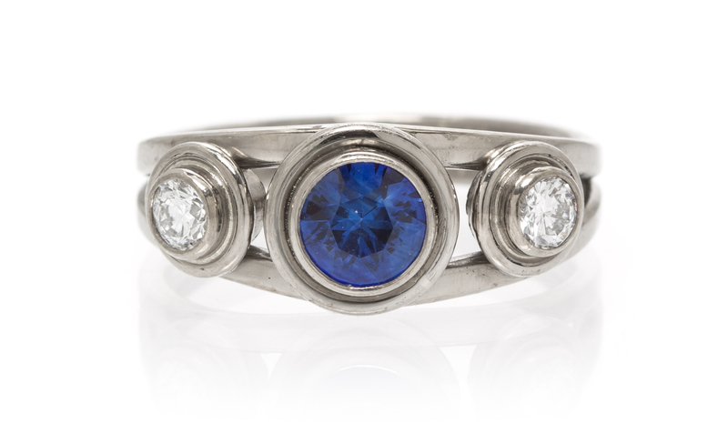 containing one round cut sapphire and two round brilliant cut diamonds.Stamp: 18K.