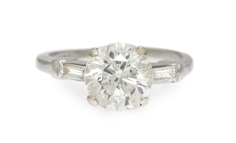 containing one old European cut diamond weighing approximately 2.25 carats and two baguette cut diamonds weighing approximately 0.22 carat total. Stamp: 10%IRID PLAT.