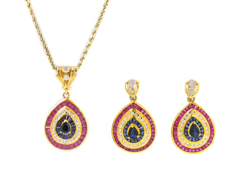 consisting of a pair of earrings containing 54 round brilliant cut diamonds weighing approximately 1.10 carats total, two pear shape sapphires measuring approximately 6.00 x 4.00 mm, 32 baguette cut sapphires weighing approximately 0.80 carat total and 72 baguette cut rubies weighing approximately 2.50 carats total, together with a pendant containing 31 round brilliant cut diamonds weighing approximately 0.65 carat total, one pear shape sapphire measuring approximately 6.50 x 5.00 mm, 16 baguette cut sapphires weighing approximately 0.64 carat total, and 28 baguette cut rubies weighing approximately 2.25 carats total, suspended from a 14 karat gold rope chain.
