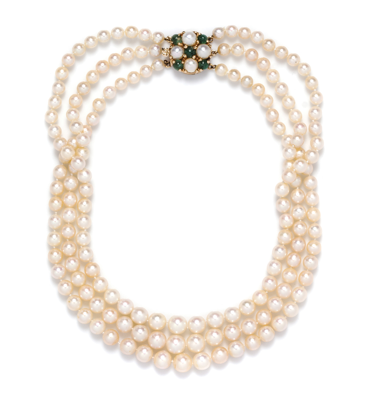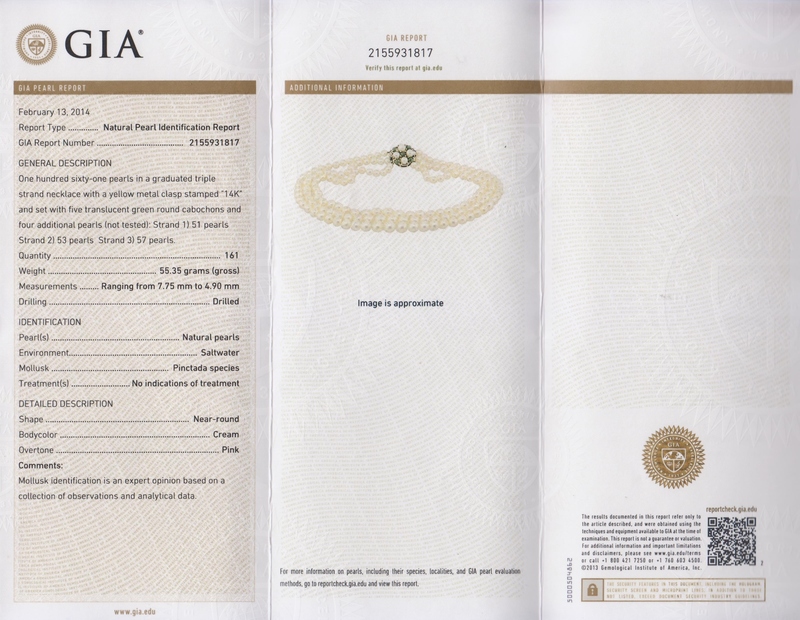consisting of three graduated strands containing 161 pearls measuring approximately 4.90-7.75 mm in diameter strung knotted with a yellow gold circular clasp containing four pearls (origin not tested) and five round cabochon cut emeralds.Accompanied by a Gemological Institute of America pearl identification certificate number 2155931817, dated February 13, 2014, stating Pearls: Natural Pearls, Environment: Saltwater, Mollusk: Pinctada Species, Treatment: No indications of treatment, Shape: Near Round, Bodycolor: Cream, Overtone: Pink.