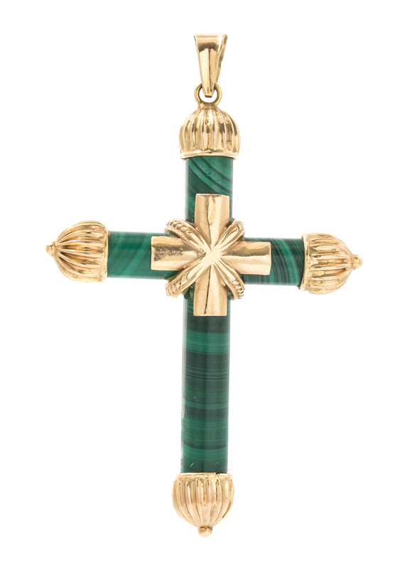 A 14 Karat Yellow Gold and Malachite Cross Pendant,