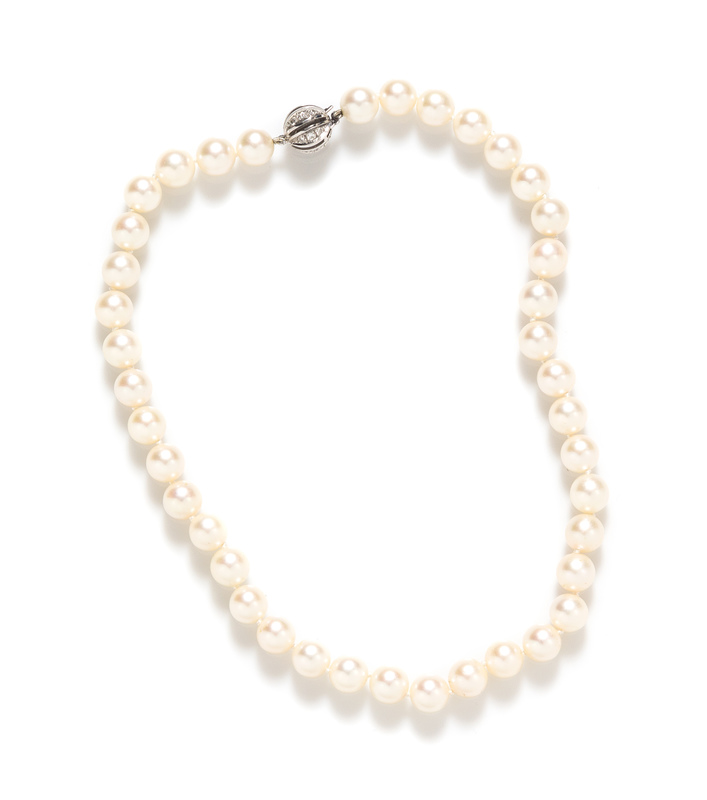 consisting of a single strand necklace of pearls measuring approximately 8.48-8.82 mm in diameter strung knotted with a 14 karat white gold openwork boule clasp containing 18 round brilliant cut diamonds weighing approximately 0.36 carat total, together with a pair of 18 karat white gold earclips containing two pearls measuring approximately 9.30-9.39 mm in diameter and 32 round brilliant cut diamonds weighing approximately 1.06 carats total.Earclips stamp: 750.Clasp stamp: 585.