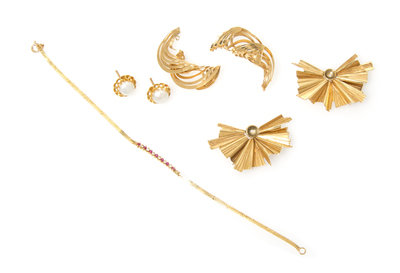 consisting of a 14 karat yellow gold ruby and diamond bracelet on a snake link chain, a pair of 14 karat yellow gold retro fan earring jackets, a pair of swirl earring jackets and a pair of yellow gold and cultured pearl button earrings.