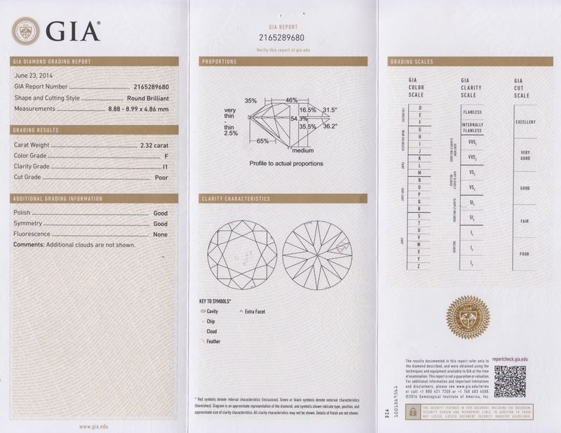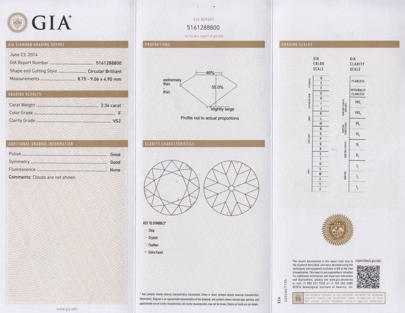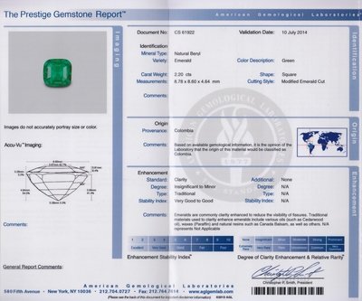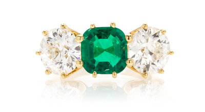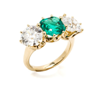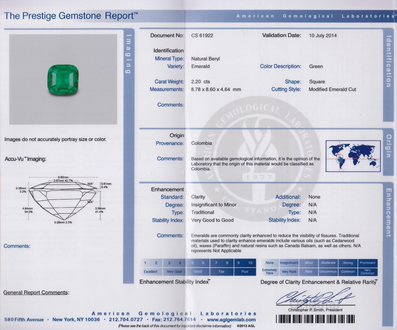 containing one square step cut emerald weighing approximately 2.20 carats and two old European cut diamonds weighing approximately 2.34 carats and 2.32 carats respectively.Accompanied by an American Gemological Laboratories emerald identification and origin certificate number CS 61922, dated July 10, 2014, stating Mineral Type: Natural Beryl, Variety: Emerald, Origin: Colombia, Clarity Enhancement: Insignificant to Minor, Type: Traditional.Accompanied by a Gemological Institute of America diamond grading certificate number 5161288800, dated June 23, 2014, stating Weight: 2.34 carats, Color: F, Clarity: VS2, Table: 46.00%, Depth: 55.00%, Polish: Good, Symmetry: Good, Fluorescence: None.Accompanied by a Gemological Institute of America diamond grading certificate number 2165289680, dated June 23, 2014, stating Weight: 2.32 carats, Color: F, Clarity: I1, Table: 46.00%, Depth: 54.30%, Polish: Good, Symmetry: Good, Fluorescence: None.