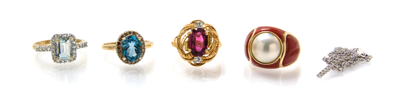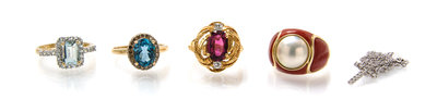 consisting of one 18 karat yellow gold ring containing one oval mixed cut pink tourmaline measuring approximately 10.86 x 7.07 x 4.30 mm and two round brilliant cut diamonds weighing approximately 0.14 carat total, one 14 karat yellow gold ring containing one round mabe pearl and four carved orange hardstone segments, one yellow gold ring containing one oval mixed cut blue topaz measuring approximately 10.86 x 7.07 x 4.30 mm and numerous round single cut brown colored diamonds weighing approximately 0.18 carat total, one 14 karat yellow gold ring containing one octagonal step cut aquamarine and numerous round brilliant cut white sapphire, together with one white gold cross pendant containing numerous single cut diamonds weighing approximately 0.10 carat total, suspended from a chain.
