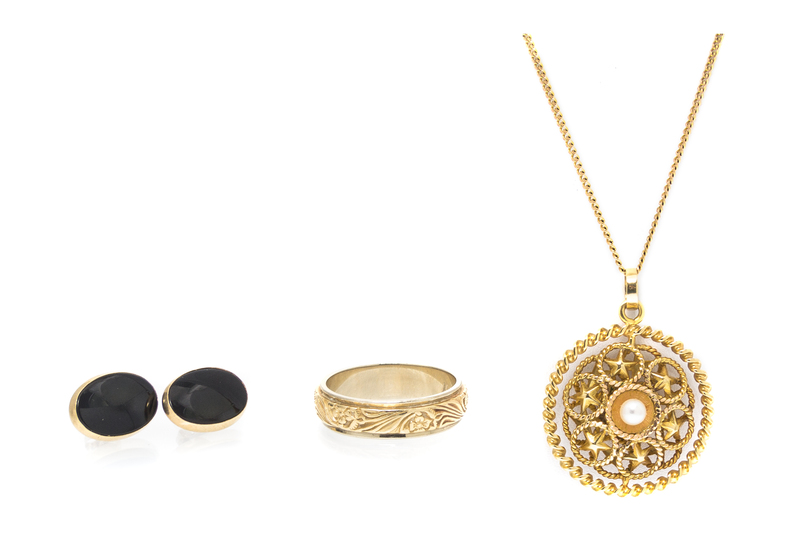 consisting of a 14 karat gold foliate motif band ring, a pair of 14 karat gold earrings containing two oval buff top cabochon cut onyx, together with an 18 karat yellow gold pendant containing one cultured pearl measuring approximately 3.85 mm in diameter and one rectangular step cut emerald, suspended from a curb link chain.