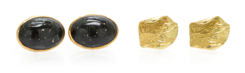 containing one pair of 14 karat yellow gold freeform and textured earrings and one pair of 18 karat yellow gold earrings containing two oval cabochons cut agate measuring approximately 13.27 x 9.69 mm. Textured earrings: 585.Agate earrings: 18K.