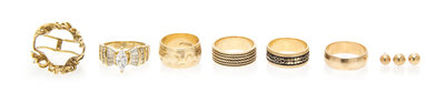 containing a 14 karat rope textured ring, a 14 karat gold ring with black enamel inlay, a 14 karat gold ring with engraved linear design, a 14 karat smooth polished band ring, a 14 karat ring with numerous marquise, round and tapered baguette shaped diamond simulants, a yellow gold leaf motif ring guard, a pair of 5.50 mm polished gold ball earstuds and a single 4.75 mm textured gold ball earstud.