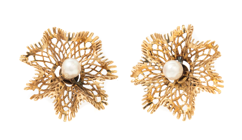 A Pair of 14 Karat Yellow Gold Cultured Pearl Ruffle Earrings,