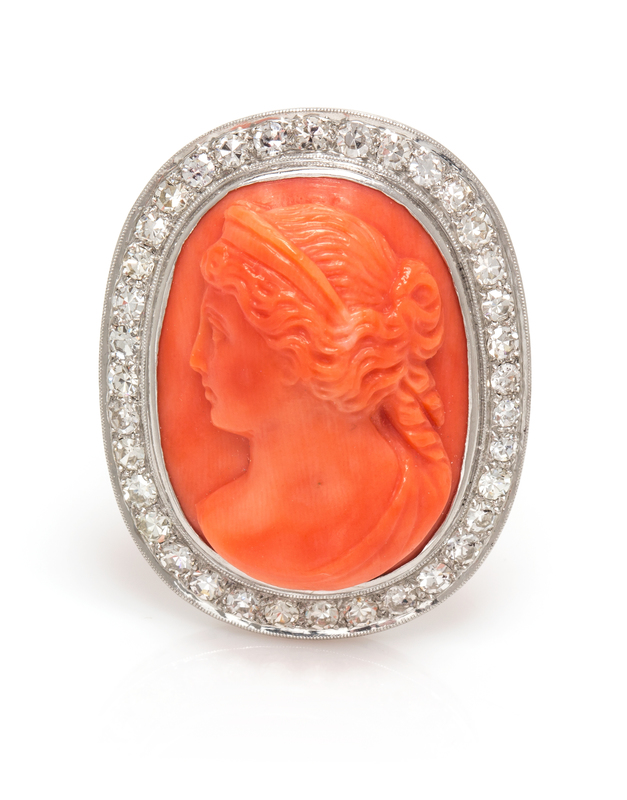 consisting of one carved coral cameo depicting the bust of a woman in profile within a millegrain edgework border containing 36 round single cut diamonds weighing approximately 1.01 carats total.