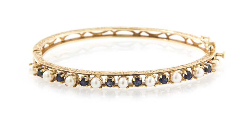 A 14 Karat Yellow Gold, Cultured Pearl and Sapphire Hinged Bangle Bracelet,