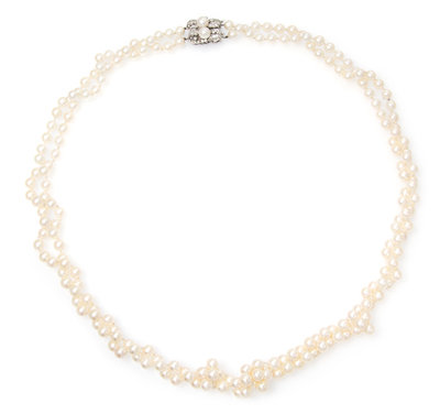 A Double Strand Cultured Pearl Necklace with White Gold and Diamond Clasp,