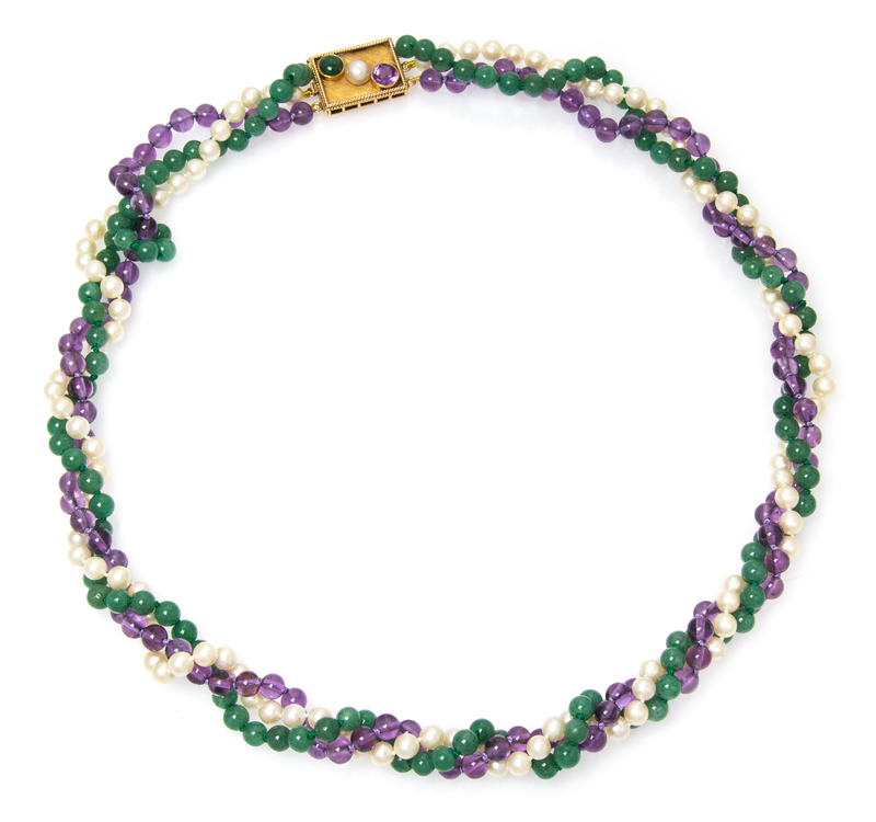 consisting of one strand of amethyst beads measuring approximately 6.75-7.18 mm in diameter, one strand of pearls measuring approximately 6.24-6.51 mm in diameter and one strand of aventurine quartz beads measuring approximately 6.54-6.96 mm in diameter, strung knotted with a 14 karat yellow gold clasp containing one pearl, one cabochon cut aventurine quartz and one round brilliant cut amethyst.Stamp: T.Y.L. 14K 0620.