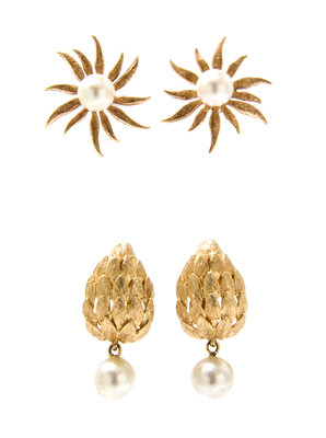 consisting one pair of sunburst motif earrings containing two pearls measuring 6.98-7.01 mm in diameter and one pair of textured feather motif earclips containing two pearls measuring approximately 8.01-8.31 mm in diameter.Stamp: 14K.