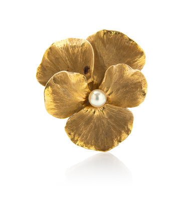 A 14 Karat Yellow Gold and Cultured Pearl Pansy Brooch,