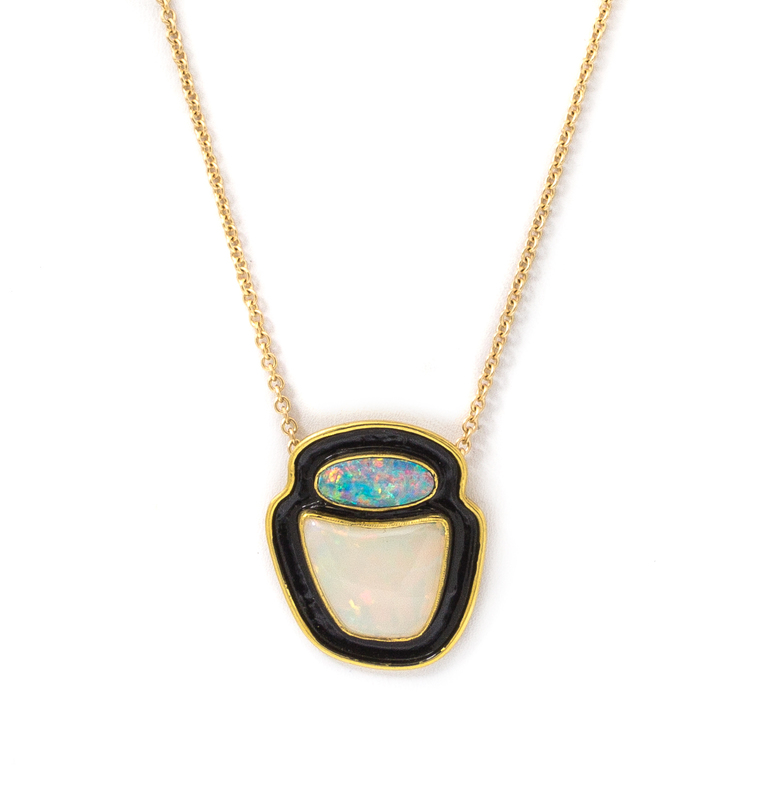consisting of a pendant containing one oval cabochon cut opal measuring approximately 13.90 x 6.32 mm and one freeform shape cabochon cut opal measuring approximately 15.90 x 17.35 mm with black enamel inlay and suspending from a 14 karat gold cable chain.Stamp: 18K (maker's mark).