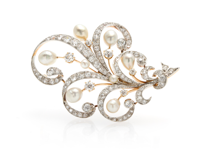 An Edwardian Platinum Topped Gold, Diamond and Pearl Brooch,