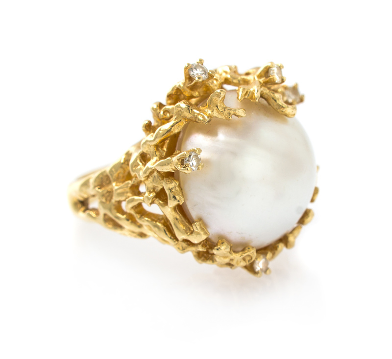 A 14 Karat Yellow Gold Mabe Pearl and Diamond Ring,
