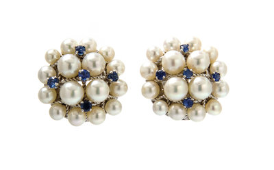 A Pair of White Gold, Cultured Pearl and Sapphire Cluster Earclips,