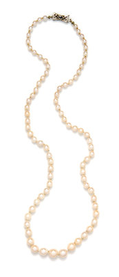 consisting of 85 pearls measuring approximately 3.61-6.89 mm in diameter strung knotted with a 10 karat white gold clasp containing one French cut sapphire. Stamp: 10K.