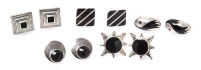 five pairs of earclips with black onyx inlay in geometric patterns.Stamp: 925.