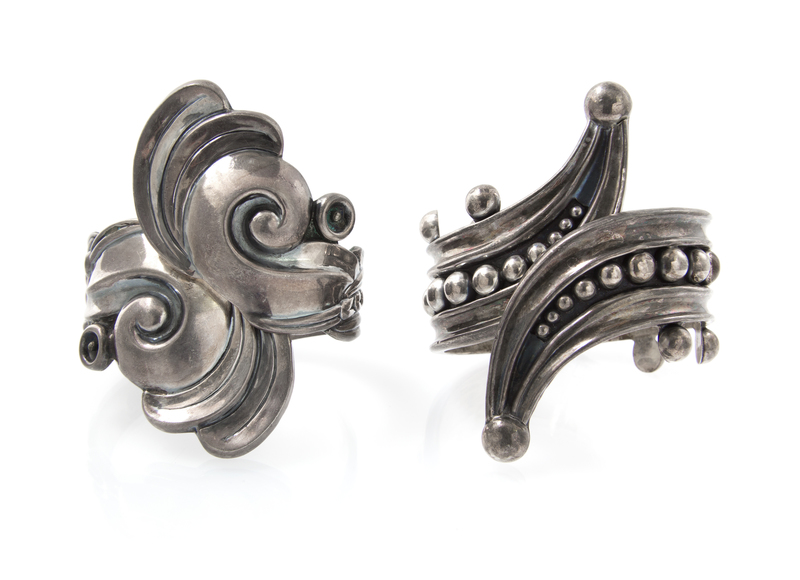 consisting of a bracelet with overlapping curvilinear and swirl designs, together with a bracelet with overlapping raised geometric designs. Curvilinear bangle stamp: STRLING 925 TOPEZ TAXCO HENCHO EN MEXICO (eagle mark)Geometric bangle stamp: STERLING 925 BALLADARES B MEXICO.