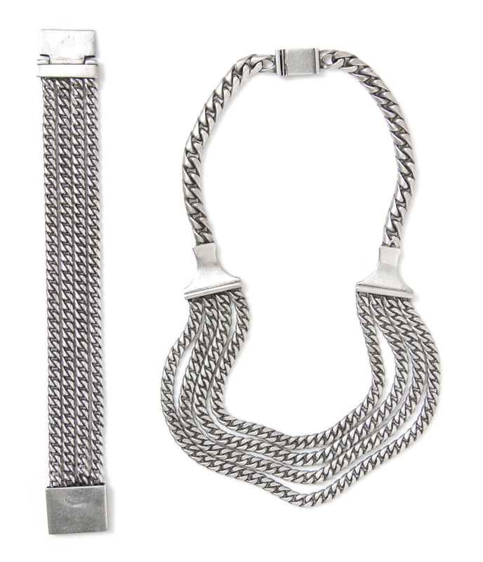 consisting of a necklace and matching bracelet containing four strands of curb link chain.Stamp: Sterling 0.925 HECHO EN MEXICO Saul.