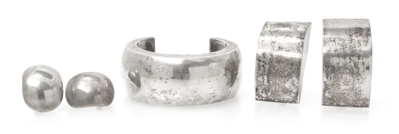 consisting of a polished cuff bangle, signed Los Ballestros, a pair of squared oval earrings, Taxco, and one pair of oversized earrings.Bangle stamp: Mexico 925 MM-34 (Los Ballesteros maker's mark).Squared oval earrings stamp: Mexico 925 (TR-57).