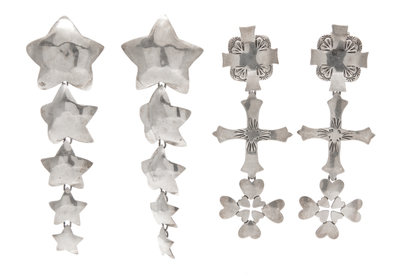 consisting of a pair of star motif earrings together with a pair of cross motif earrings. Earrings stamp: Sterling Jean Mason Santa Fe.