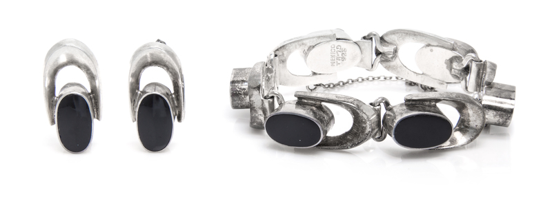 consisting of a bracelet containing six "U" shaped links and a matching pair of earrings each containing oval onyx plaques.Stamp: MEXICO TA-79 925.