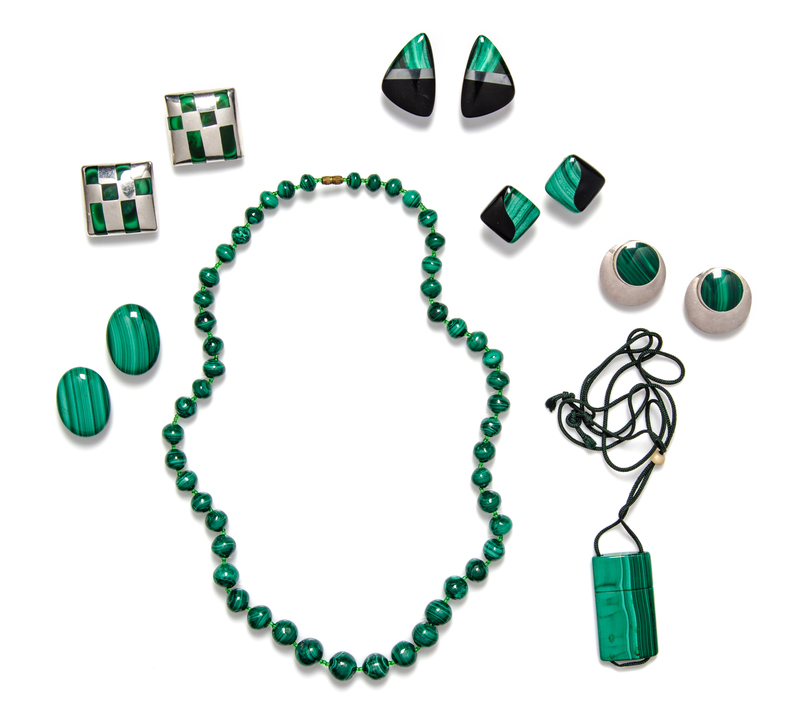 A Collection of Silver, Malachite, and Onyx Jewelry,